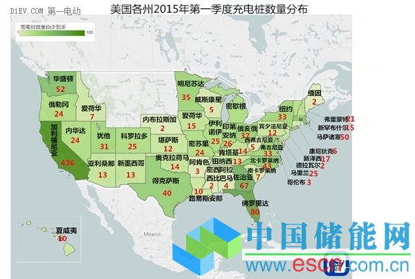 從50個(gè)州和一個(gè)聯(lián)邦直轄特區(qū)的分布情況看,只剩下5個(gè)州沒有建立公共充電設(shè)施,加州以436個(gè)充電樁居首。