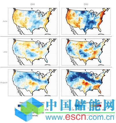 下面這副圖片則向我們展示了美國(guó)今年夏天太陽(yáng)能輻照強(qiáng)度與往年平均值相比的波動(dòng)情況。