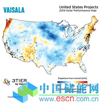 Vaisala公司可以為風(fēng)能和太陽(yáng)能項(xiàng)目開(kāi)發(fā)商提供資源變化的統(tǒng)計(jì)數(shù)據(jù)。當(dāng)該公司分析員統(tǒng)計(jì)今年的太陽(yáng)能輻射資源數(shù)據(jù)時(shí),發(fā)現(xiàn)美國(guó)西部今年晴天的太陽(yáng)能輻射數(shù)據(jù)與往年相比有非常大的波動(dòng)。