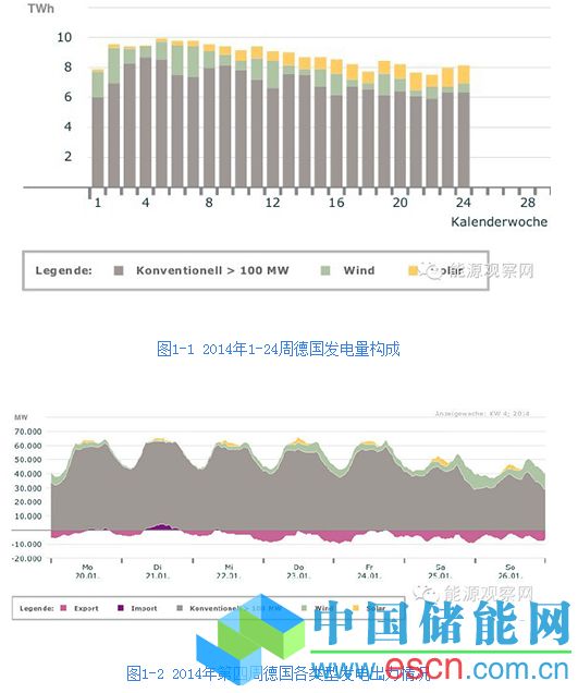 回答一:否。在能源資源枯竭預(yù)期、環(huán)境保護(hù)、應(yīng)對(duì)氣候變化等客觀約束下,擺脫化石能源依賴成為人們對(duì)未來能源圖景的最美好愿望,但實(shí)現(xiàn)遠(yuǎn)比愿望殘酷。由于光伏和風(fēng)電受天氣條件影響,發(fā)電出力具有間歇性和不穩(wěn)定性,用專業(yè)術(shù)語講,就是容量可信度(capacity credit)很低。以德國為例,2014年第1-24周(2013年12月30日-2014年6月15日)德國各類型發(fā)電量構(gòu)成如圖1-1所示??梢钥闯觯夥娏吭诿恳恢芾锼嫉谋壤顒e非常大。尤其是在第四周(1月20-26日,如圖1-2),光伏最大瞬時(shí)出力僅為410萬千瓦,僅占光伏總裝機(jī)容量的11%。該周內(nèi)光伏發(fā)電量僅為8000萬千瓦時(shí),相當(dāng)于每天光伏滿負(fù)荷運(yùn)行時(shí)間僅為18分鐘。在光伏、風(fēng)電均不給力的情況下,需要煤電、氣電、核電等常規(guī)電源頂上。