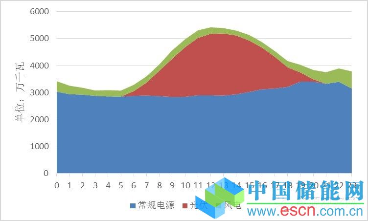 從13:00其他各類型電源出力情況看,核電882.1萬千瓦,抽水蓄能67.8萬千瓦,常規(guī)水電100萬千瓦,氣電56萬千瓦,油電15萬千瓦,褐煤1385萬千瓦,生物質(zhì)4萬千瓦,其他常規(guī)電源379萬千瓦??梢钥闯?,當(dāng)日光伏以外的其他電源出力之和,以及風(fēng)電出力都沒有發(fā)生大的波動,中午高峰負荷需求基本上都由光伏滿足。