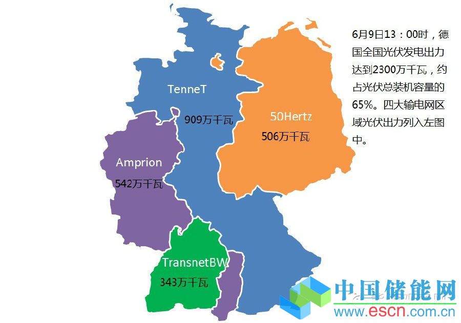 德國國土面積大概36萬平方公里,比我國四川省面積還小,南北直線距離為876公里,東西直線距離為640公里,所以太陽輻照的全國一致性比較好,光伏出力的同時率也比較高。6月9日13:00時德國光伏出力達到2300萬千瓦,而光伏發(fā)電總裝機約3500萬千瓦,光伏最大出力占裝機容量的比例約65%。6月9日13:00四大輸電網(wǎng)區(qū)域光伏出力分布圖如圖2所示。