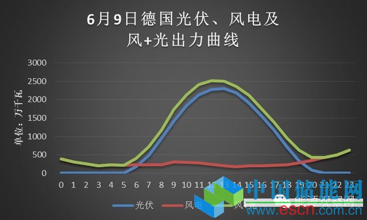 一般認為,風(fēng)電和光伏出力均具有波動性,但是兩者擬合之后的出力曲線的波動性會減弱,德國是否也負荷這一規(guī)律呢?還是讓事實說話。我們發(fā)現(xiàn),當(dāng)日德國風(fēng)電出力非常弱,全天波動性并不大,基本維持在300萬千瓦左右,這相對于全國3300萬千瓦左右的風(fēng)電裝機來說確實小的可憐,風(fēng)電出力占風(fēng)電裝機容量的比重僅為10%左右。中午光伏大發(fā)時段,風(fēng)電出力也沒有明顯波動,所以風(fēng)+光的出力曲線與光伏出力曲線走向非常吻合。當(dāng)然,這只能代表6月9日這一天的情況。