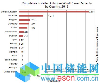 雖然海上風(fēng)電項(xiàng)目?jī)H占全球風(fēng)電裝機(jī)容量的2%多一點(diǎn),但是2013年年安裝量達(dá)到第七的成績(jī)表明海上風(fēng)電項(xiàng)目正在快速發(fā)展。7100兆瓦海上風(fēng)電的超過(guò)半數(shù)以上是英國(guó)開(kāi)發(fā)的,2013年英國(guó)就在該國(guó)水域內(nèi)形成了730兆瓦風(fēng)電規(guī)模,而丹麥、德國(guó)和比利時(shí)則分別新增了至少190兆瓦而處于風(fēng)電開(kāi)發(fā)的第二陣營(yíng),中國(guó)則只新增了39兆瓦的海上風(fēng)電開(kāi)發(fā)規(guī)模。越南和西班牙都是首次開(kāi)展海上風(fēng)電項(xiàng)目,美國(guó)則也以一個(gè)非常小的位于緬因州海岸附近的項(xiàng)目開(kāi)始海上風(fēng)電的探索。