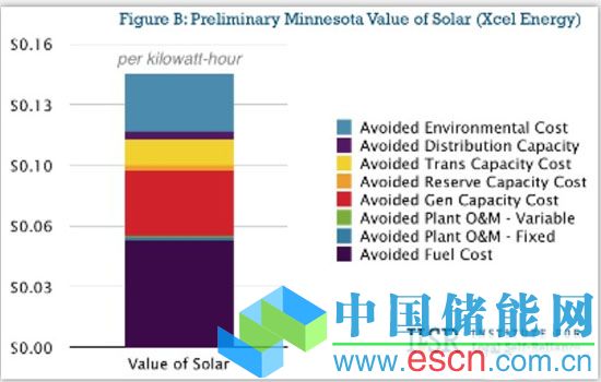 目前,明尼蘇達州已通過“太陽能價值”政策。該政策包含所有理論型政策的基本要點。下圖B展示出各種成分的相對價值及總價值,主要基于明尼蘇達州公共事業(yè)委員會訴訟期間的初期評估。