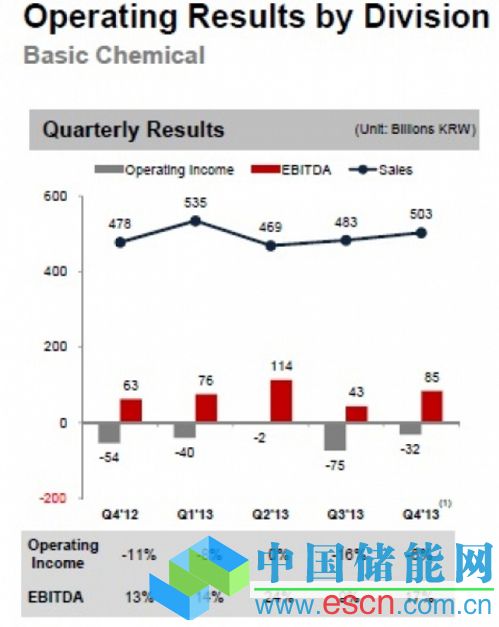 銷售額的提高及穩(wěn)定的價格致使BasicChemical部門運營虧損創(chuàng)紀錄為320億韓元(3000萬美元),而2013年第三季度運營虧損為751億韓元(7040萬美元)。