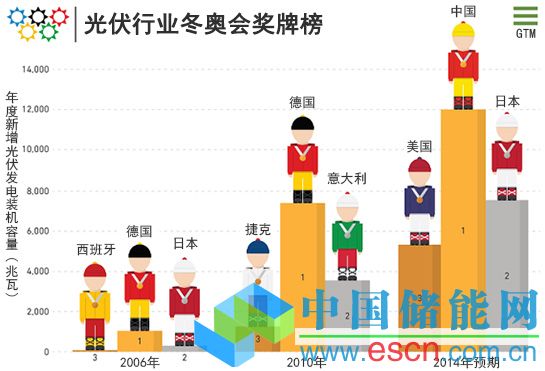 金牌:一個全新的面孔——中國。中國領導人曾表示,2014年新增光伏裝機容量目標是14,000兆瓦,以應對圍繞污染、霧霾和火電廠日益嚴重的不滿情緒。GTM稱,上述新增裝機容量高于美國光伏行業(yè)有史以來的裝機容量之和。