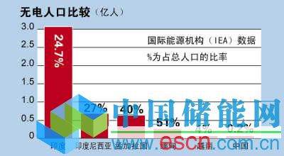 中國(guó)儲(chǔ)能網(wǎng)訊:亞洲2個(gè)大國(guó)中國(guó)和印度,在電力供應(yīng)方面存在巨大的差距。國(guó)際能源署(IEA)最近公布的《世界能源展望》顯示,從無(wú)法使用電力的人口占總?cè)丝诘谋壤齺?lái)看,2011年中國(guó)已經(jīng)基本為零,而印度則達(dá)到約25%(3億人)。尤其是在農(nóng)村地區(qū)的電力供給率方面,印度存在巨大差距。