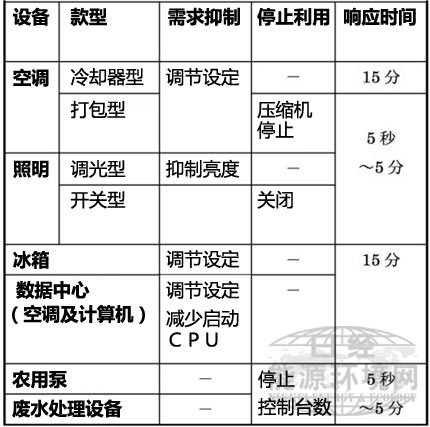 美國(guó)勞倫斯伯克利國(guó)家研究室2012年7月公布了以“高速自動(dòng)需求響應(yīng)與可再生能源整合”為題的報(bào)告。據(jù)該報(bào)告推算,如果以整個(gè)加利福尼亞州的商業(yè)及產(chǎn)業(yè)設(shè)施中可調(diào)節(jié)輸出功率的電力設(shè)備為對(duì)象實(shí)施高速自動(dòng)需求響應(yīng),就可抑制0.18~0.9吉瓦的電力需求(表1)。