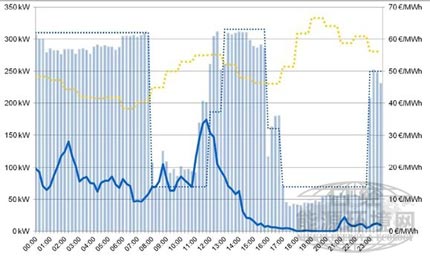直方柱表示冷庫(kù)耗電量,實(shí)線曲線表示風(fēng)力發(fā)電量,淺色虛線表示電力現(xiàn)貨價(jià)格,深色虛線表示事先預(yù)測(cè)的負(fù)載分配??赏ㄟ^(guò)在啟動(dòng)風(fēng)力發(fā)電時(shí)進(jìn)行冷卻,在電價(jià)較高時(shí)段抑制運(yùn)轉(zhuǎn),享受成本價(jià)值。(出處:EWEP)(點(diǎn)擊放大)