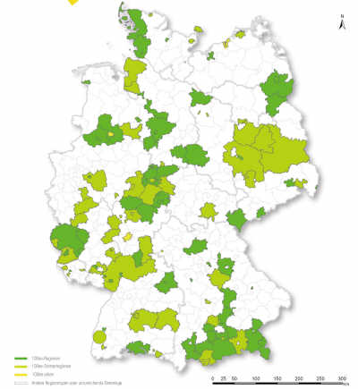 德國(guó)295個(gè)行政區(qū)域中3個(gè)縣區(qū):北弗里斯蘭、普利希尼茨、迪特馬爾申可再生能源供電量分別達(dá)到260%、261%、280%,創(chuàng)造了“能源轉(zhuǎn)型”的奇跡,成為德國(guó)乃至整個(gè)歐洲的綠色榜樣。與此同時(shí),德國(guó)其他區(qū)域也不甘示弱,或已實(shí)現(xiàn)了100%可再生能源電力,或在不斷接近這個(gè)數(shù)值。(如圖所示)