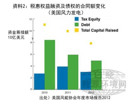 實際上,稅惠權(quán)益融資在風(fēng)力融資中所占的比例正趨于下降。據(jù)美國風(fēng)能協(xié)會的報告統(tǒng)計,2012年的風(fēng)力發(fā)電投資額方面,稅惠權(quán)益融資為30億美元(風(fēng)力開發(fā)量為393萬千瓦),債權(quán)為49億美元(427萬千瓦),直接投資為169億美元(594萬千瓦)。而2011年,稅惠權(quán)益融資為39億美元,債權(quán)為59億美元(資料2)。