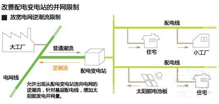 不過,如果允許電力逆流向容量寬裕的電網(wǎng),配電變電站的容量問題便可得到解決。因此,日本政府及電力公司制定了有條件地允許逆潮流的方針,即作為發(fā)生事故時的安全對策,由太陽能發(fā)電運營商承擔費用負責追加設置逆潮流斷路器。不過,逆潮流斷路器的成本1臺高達5000萬到1億日元。許多發(fā)電運營商將面臨是接受并網(wǎng)容量限制還是承擔成本增加并網(wǎng)容量的選擇。