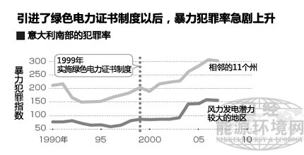 意大利FEEM研究中心的研究員卡特利娜•杰內(nèi)奧里和馬西莫•塔波尼在2011年發(fā)表的報(bào)告書(shū)中,公布了從1990年到2007年,意大利南部風(fēng)力發(fā)電開(kāi)發(fā)活動(dòng)與犯罪組織違法行為數(shù)量之間的關(guān)聯(lián)性。