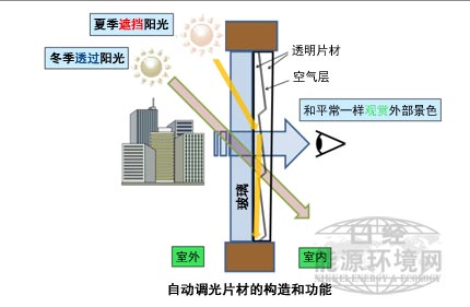 中國儲能網(wǎng)訊:日本產(chǎn)業(yè)技術(shù)綜合研究所與住友化學公司合作,日前共同開發(fā)出了可在夏季遮擋陽光、冬季透過陽光的新式自動調(diào)光片材。該技術(shù)利用夏冬兩季陽光入射角的不同,在入射角較大的夏季,通過反射光來遮擋陽光,而在入射角較小的冬季,通過使光透過,向室內(nèi)聚集熱量。
