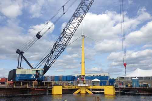 中國儲能網(wǎng)訊:近幾年來,由于美國政府頒布了可再生能源稅收減免政策,于是該國國內(nèi)的風(fēng)力發(fā)電機數(shù)量不斷出現(xiàn)增長--不過,它們都是被安裝在地面上。今日,這一傳統(tǒng)將被改寫。據(jù)悉,北美首座海上風(fēng)力發(fā)電機VolturnUS正式在緬因州的佩諾布斯科特河上落成。