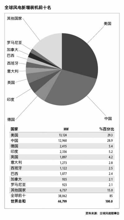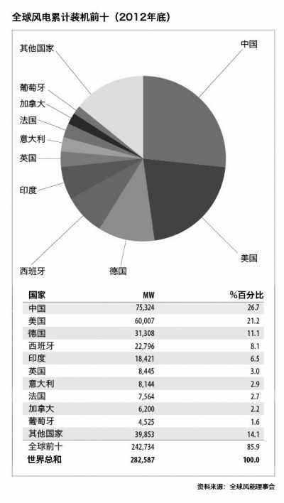 2009-2011年,中國保持年新增裝機容量全球第一的位置。而2012年美國僅以164 MW的優(yōu)勢,重回年新增裝機市場全球第一的地位。然而,美國的生產(chǎn)稅收抵免(PTC)政策推遲到2013年1月1日宣布延續(xù),意味著2013年美國市場的裝機容量將陡然下降,而后在2014年逐漸恢復。受到歐洲主權債務危機等影響,歐洲各國的國內(nèi)可再生能源政策具有不確定性,歐洲2012年的創(chuàng)紀錄的裝機容量將在很可能要到2014年才可能重演。