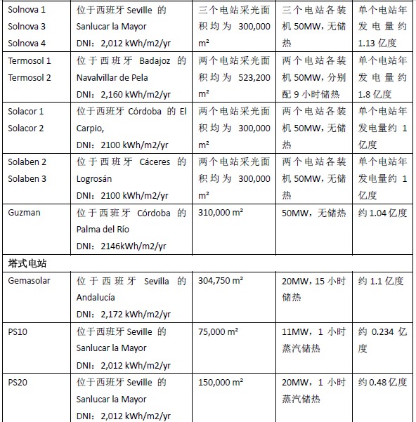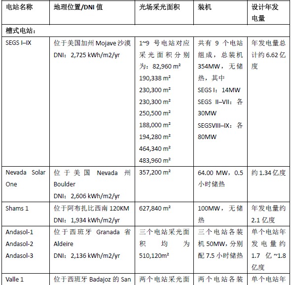 從上表可見,在槽式光熱電站建設(shè)最多的西班牙市場,由于政策方面的限定,幾乎所有電站的裝機均為50MW,鑒于項目所在地的DNI差別不大,多個電站的配置和發(fā)電量相差不多,一個50MW的無儲熱槽式光熱電站,其采光面積在30萬平方米左右,發(fā)電量1億度左右。配置儲熱后,采光面積需同步增加,發(fā)電量也大幅增加。塔式和菲涅爾光熱發(fā)電的已投運商業(yè)化項目較少,碟式為零。