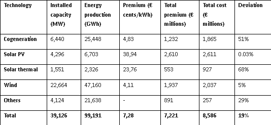 特別要指出的是,光伏產(chǎn)業(yè)補(bǔ)貼僅僅超出原先計(jì)劃(總預(yù)算為26.1億歐元)的0.03%,達(dá)到26.11億歐元,而其他可再生能源才是電力赤字的主要“罪魁禍?zhǔn)?rdquo;,其中包括光熱發(fā)電超過(guò)預(yù)算68%(5.53億歐元),熱電聯(lián)產(chǎn)超過(guò)預(yù)算51%(12.3億歐元),風(fēng)電則超過(guò)預(yù)算5%(19億歐元)。