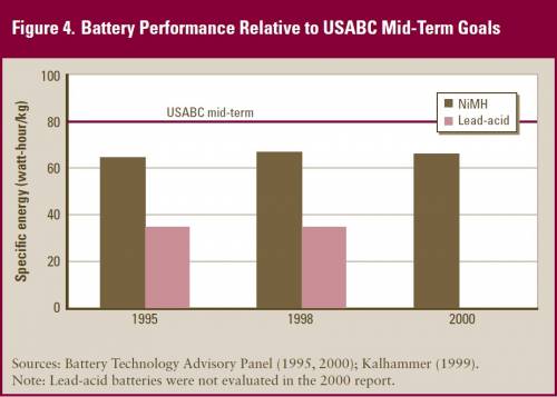 但一切的協(xié)助都沒法改變電池發(fā)展的客觀規(guī)律。如下圖,鎳氫電池和鉛酸電池的能量密度在十年中并未提高到USABC的目標(biāo),也因此沒法實(shí)現(xiàn)ZEV項(xiàng)目的目標(biāo)。