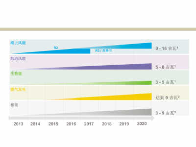 1英國(guó)可再生能源發(fā)展路線圖,2012年12月。根據(jù)未來(lái)能源需求,成本軌跡、工業(yè)領(lǐng)域所能達(dá)到的部署水平,每項(xiàng)可再生能源發(fā)電技術(shù)現(xiàn)有發(fā)電能力較小。