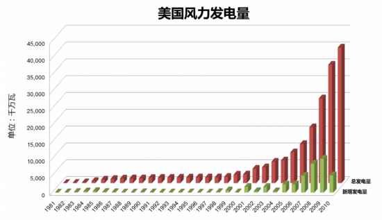 1月1日,美國聯(lián)邦政府對(duì)風(fēng)電投資的生產(chǎn)稅抵免政策將到期。在過去的20年中,這一政策抵消了風(fēng)力渦輪機(jī)30%的建設(shè)成本。再加上美國有29個(gè)州強(qiáng)制執(zhí)行為綠色能源制定的“可再生能源配額機(jī)制”,結(jié)果我們看到風(fēng)力發(fā)電廠在美國遍地開花。自2007年開始,美國40%的新增發(fā)電機(jī)組都是風(fēng)電。目前,風(fēng)電占美國發(fā)電總量的3.5%。