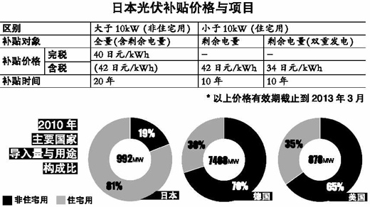 相較于其他歐洲國家與我國對太陽能發(fā)電的補助金政策,日本在這方面更為大手筆。從2012年7月1日開始實施的太陽能發(fā)電補貼政策,對于大于10kW的非住宅用項目,其補貼稅前價格達到了42日元/kWh,周期為20年。這個補貼價格相當于德國和意大利的兩倍,相當于我國的三倍。以一個50MW的非住宅用發(fā)電項目為例,其20年的補貼總金額可以達到100億元人民幣甚至更高,遠遠高于大多數(shù)其他國家對光伏發(fā)電的補貼額。