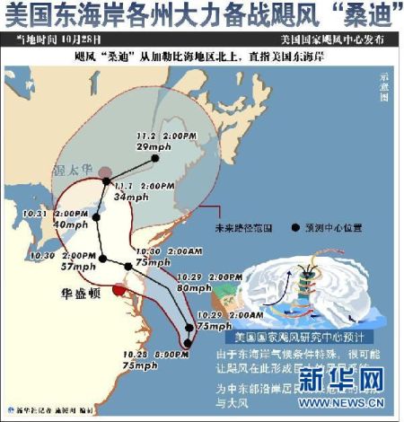 李洋:根據(jù)美國(guó)國(guó)家颶風(fēng)中心的最新消息,一級(jí)颶風(fēng)桑迪目前的中心已經(jīng)移動(dòng)到位于新澤西東60多公里處。預(yù)計(jì)一個(gè)小時(shí)之內(nèi)就將在新澤西州一帶登陸,估計(jì)會(huì)造成上百億美元的經(jīng)濟(jì)損失,美國(guó)媒體正在進(jìn)行廣泛的報(bào)道。