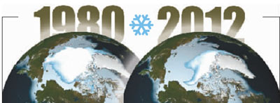 1980年,浮冰覆蓋了北極的大部分海域。多年海冰以每10年萎縮15.1%的驚人速度消失,2012年冬多年海冰再次萎縮,創(chuàng)下了第二個最低紀錄。
