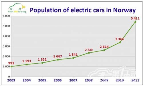 挪威電動汽車協(xié)會(Norwegian Electric Vehicle Association)公布的數(shù)據(如下圖)顯示,2003年挪威電動汽車保有量為991輛,2011年底,電動汽車數(shù)量猛增至5411輛,較上年增長61%。