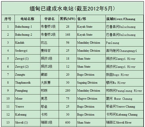 截至2012年5月,緬甸已建成水電站18個(gè),總裝機(jī)容量2600MW,具體項(xiàng)目名稱如下: