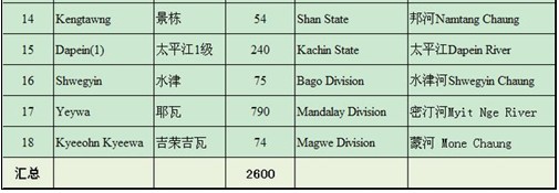 緬已建成水電項(xiàng)目名稱及裝機(jī)容量一覽表