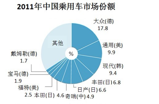 美德企業(yè)在中國(guó)新車市場(chǎng)上保持優(yōu)勢(shì)。作為上世紀(jì)80年代初就進(jìn)入中國(guó)的外資企業(yè),德國(guó)大眾汽車在中國(guó)乘用車市場(chǎng)上占據(jù)著近20%的最大份額;上世紀(jì)90年代開始,在中國(guó)國(guó)內(nèi)從事生產(chǎn)的美國(guó)通用汽車也在中國(guó)市場(chǎng)上推出了從小型車到高檔車的多種車型;高檔車市場(chǎng)上,大眾汽車旗下的奧迪、德國(guó)戴姆勒、寶馬等品牌影響力已經(jīng)在中國(guó)深入人心。
