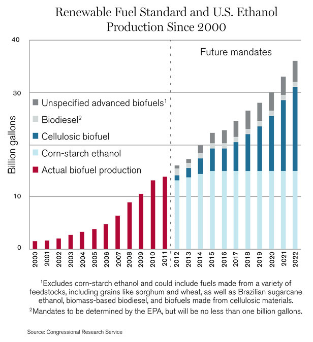 2013年,更多的幾家工廠應(yīng)該開(kāi)始商業(yè)化生產(chǎn),但是,很難相信,生物燃料工業(yè)會(huì)接近生產(chǎn)10億加侖,這就是這一年的目標(biāo),是國(guó)會(huì)在2007年設(shè)定的。而2022年規(guī)定的生物燃料總產(chǎn)量是360億加侖,其中,160億加侖是纖維質(zhì),看來(lái)每年都更不現(xiàn)實(shí)了。