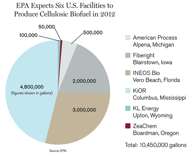 2012年,環(huán)境保護(hù)局認(rèn)為,根據(jù)它的分析,有六套設(shè)備今年計(jì)劃上線,這一新生產(chǎn)業(yè)的產(chǎn)能接近1050萬(wàn)加侖,相比之下,初定的目標(biāo)是5億加侖。上面的圖表也表明:根據(jù)公司和設(shè)施情況,環(huán)保局下調(diào)了預(yù)測(cè),就是對(duì)2012年纖維質(zhì)生物燃料產(chǎn)量的預(yù)測(cè)。