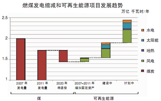 和煤炭行業(yè)的萎縮相比,美國的可再生能源發(fā)展正如火如荼。2007年到2011年之間,風(fēng)電、水電和燃?xì)怆娬镜陌l(fā)電量增長填補(bǔ)了燃煤電站退出所留下的缺口。