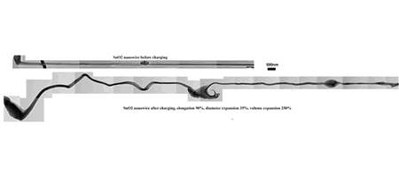 在研究中他們意外的發(fā)現(xiàn),二氧化錫納米線在充電過程中長度幾乎拉伸了一倍,而不是像之前的預(yù)測那樣寬度拉伸。這樣的發(fā)現(xiàn)有助于改善鋰電池設(shè)計,防止導(dǎo)致電池壽命縮短的內(nèi)部短路現(xiàn)象。