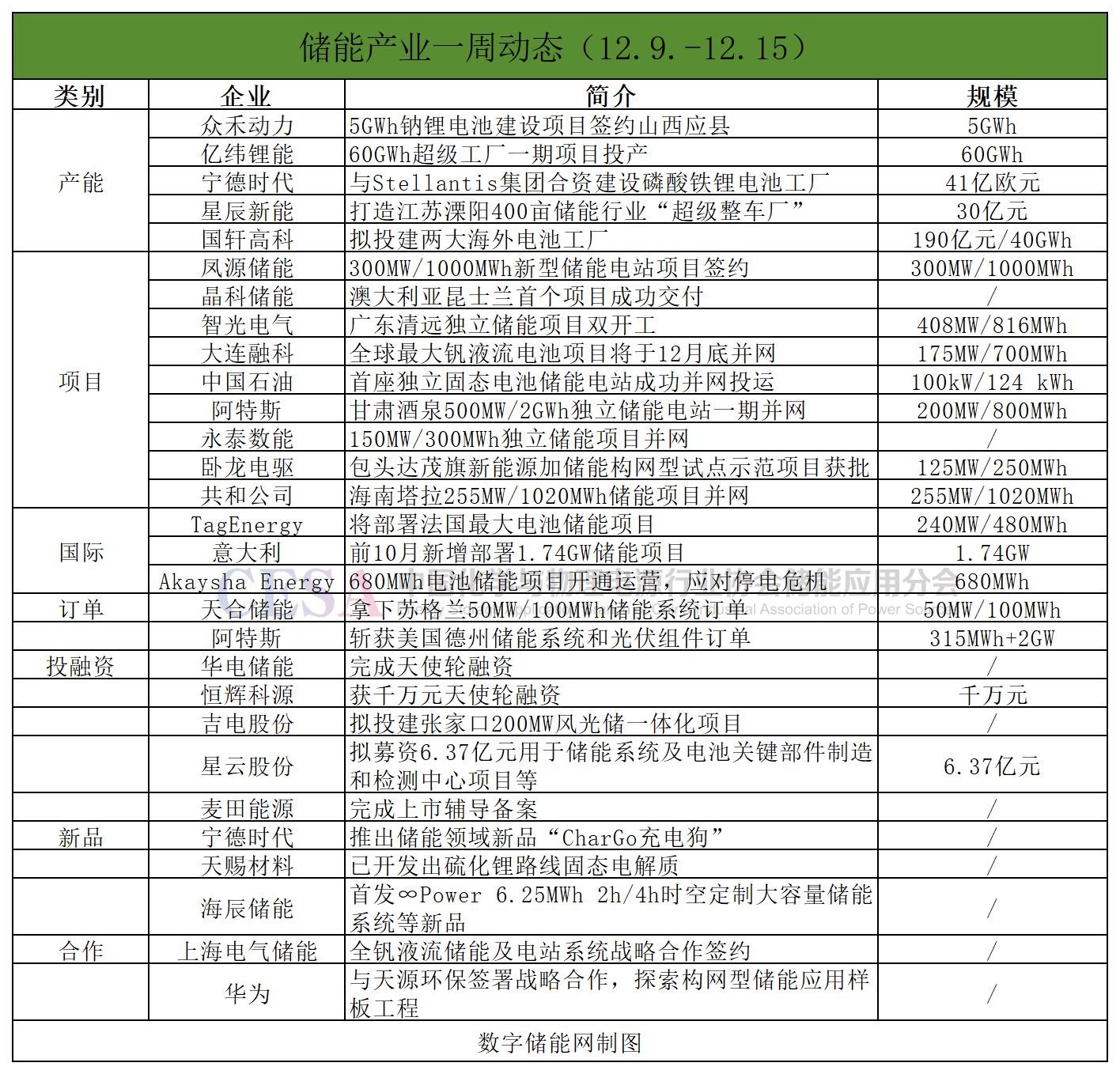 項(xiàng)目方面,林州鳳源儲能與河南拓樸工程公司300MW/1000MWh磷酸鐵鋰+全釩液流新型儲能電站項(xiàng)目簽約;大連融科儲能宣布將于12月底在中國完成全球規(guī)模最大的釩液流電池項(xiàng)目;共和公司海南塔拉255MW/1020MWh儲能項(xiàng)目并網(wǎng);臥龍電驅(qū)公告內(nèi)蒙古包頭達(dá)茂旗新能源加儲能構(gòu)網(wǎng)型試點(diǎn)示范項(xiàng)目獲批,包含125MW/250MWh構(gòu)網(wǎng)型儲能;阿特斯甘肅酒泉500MW/2GWh獨(dú)立儲能電站一期200MW/800MWh項(xiàng)目并網(wǎng);智光電氣廣東清遠(yuǎn)兩個(gè)獨(dú)立儲能項(xiàng)目開工,規(guī)模共408MW/816MWh。