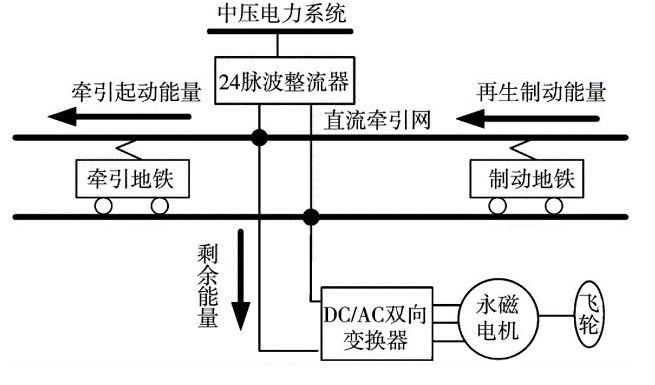 城市地鐵交通具有站間距短、載客量大、安全準(zhǔn)點,以及車輛啟動加速快、制動減速頻繁等特點,當(dāng)車輛再生制動時,將產(chǎn)生巨大的制動能量。動態(tài)能量回收系統(tǒng)可以在制動期間輔助回收動能,并將其存儲在各種儲能單元中,并在加速條件下使用。由于具有能量密度大、能量轉(zhuǎn)換效率高、工作壽命年限長、充放電時間短等優(yōu)點,飛輪儲能作為一種新型的儲能裝置,是地鐵交通能量回收的合適選擇。