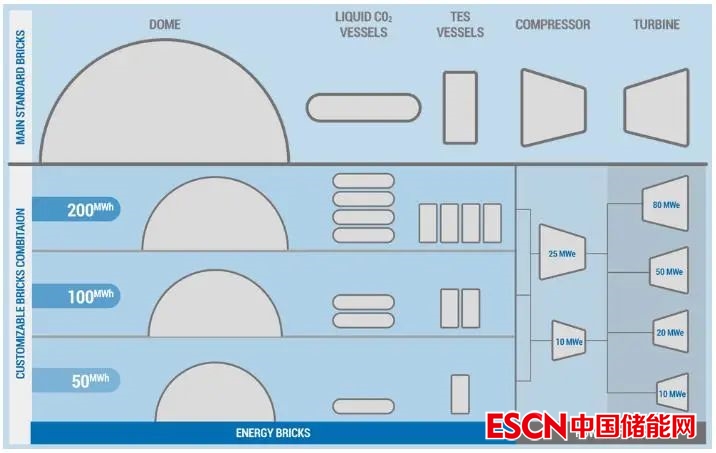 4)模塊化系統(tǒng)。二氧化碳儲能系統(tǒng)將是模塊化的,可以根據需要擴展到任何尺寸。液態(tài)二氧化碳容器、壓縮機、渦輪機均有不同尺寸,使用者可以根據需要,以最合適的充電或放電率來優(yōu)化設計。