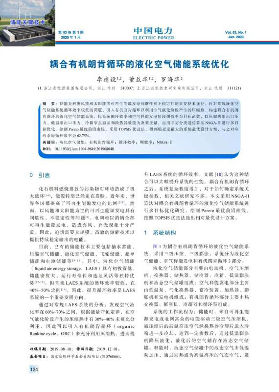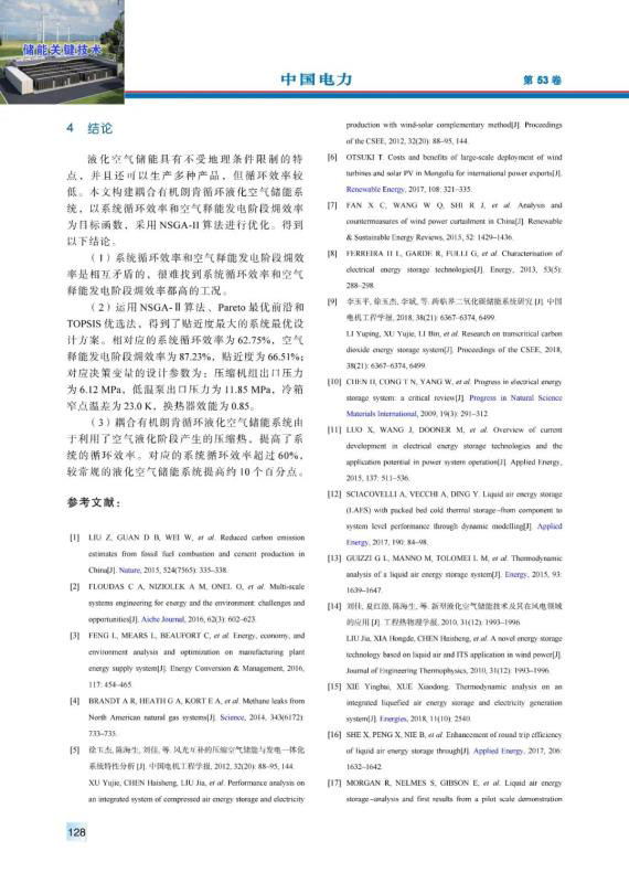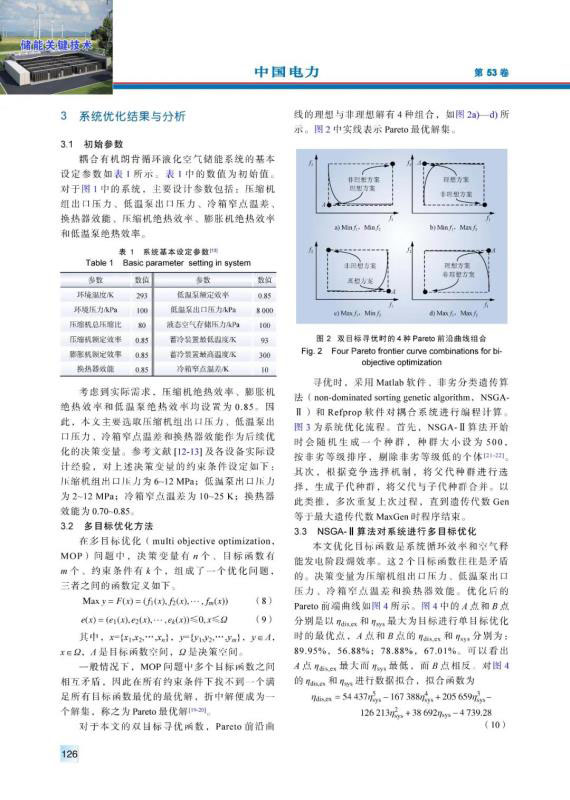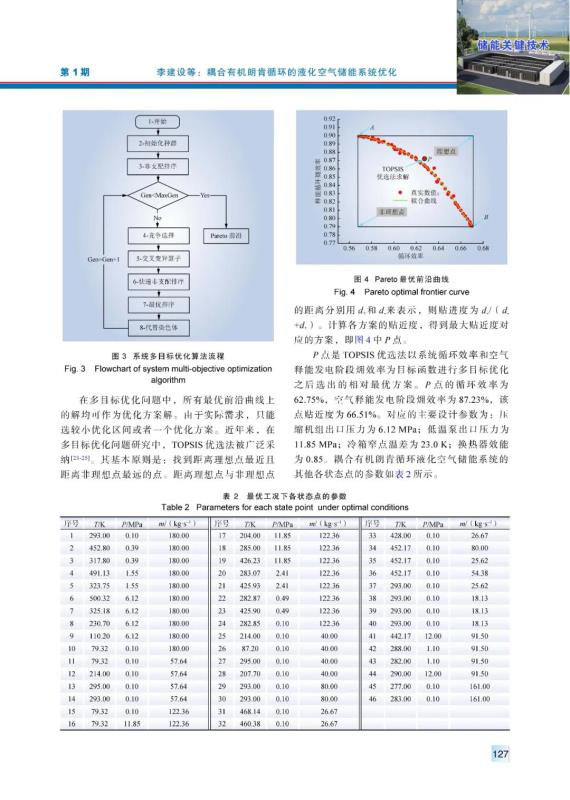 儲(chǔ)能是解決風(fēng)能和太陽能等可再生能源發(fā)電間歇性和不穩(wěn)定性的重要技術(shù)途徑。針對(duì)常規(guī)液化空氣儲(chǔ)能系統(tǒng)循環(huán)效率較低的問題,引入有機(jī)朗肯循環(huán)以利用空氣液化階段產(chǎn)生的壓縮熱。構(gòu)建耦合有機(jī)朗肯循環(huán)的液化空氣儲(chǔ)能系統(tǒng),以系統(tǒng)循環(huán)效率和空氣釋能發(fā)電階段?效率為目標(biāo)函數(shù),以壓縮機(jī)組出口壓力、低溫泵出口壓力、冷箱窄點(diǎn)溫差和換熱器效能為決策變量,運(yùn)用非劣分類遺傳算法NSGA-Ⅱ進(jìn)行多目標(biāo)優(yōu)化。繪制Pareto最優(yōu)前沿曲線,采用TOPSIS優(yōu)選法,得到貼近度最大的系統(tǒng)最優(yōu)設(shè)計(jì)方案,與之對(duì)應(yīng)的系統(tǒng)循環(huán)效率為62.75%。