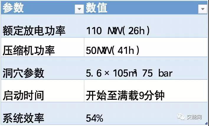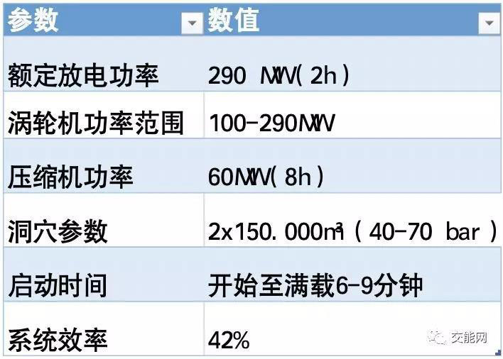 機組的壓縮機功率60MW,釋能輸出功率為290MW,最長額定輸出時間為2小時。系統(tǒng)將壓縮空氣存儲在地下600m的廢棄礦洞中,礦洞總?cè)莘e達3.1×105m3,壓縮空氣的壓力最高可達10MPa。機組可連續(xù)充氣8h,連續(xù)發(fā)電2h。該電站在1979年至1991年期間共啟動并網(wǎng)5000多次,平均啟動可靠性97.6%。電站采用天然氣補燃方案,實際運行效率約為42%,扣除補燃后的實際效率為19%。