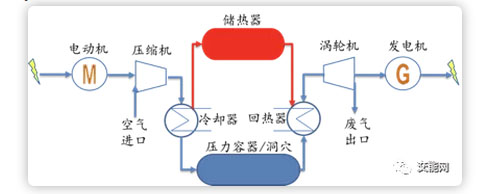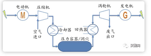 其工作原理是,在用電低谷時段,利用電能將空氣壓縮至高壓并存于洞穴或壓力容器中,使電能轉(zhuǎn)化為空氣的內(nèi)能存儲起來;在用電高峰時段,將高壓空氣從儲氣室釋放,進入燃燒室燃燒利用燃料燃燒加熱升溫后,驅(qū)動渦輪機發(fā)電。其原理圖如下:
