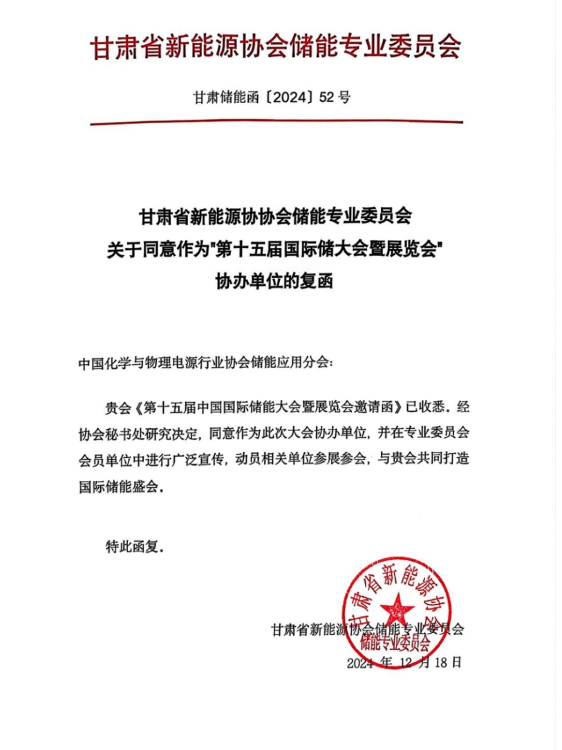 中國儲能網(wǎng)訊:近日,甘肅省新能源協(xié)會儲能專業(yè)委員會復(fù)函中國化學(xué)與物理電源行業(yè)協(xié)會儲能應(yīng)用分會,同意作為第十五屆中國國際儲能大會暨展覽會(CIES2025)協(xié)辦單位,并在專業(yè)委員會會員單位中進行廣泛宣傳,動員相關(guān)單位參展參會,與中國化學(xué)與物理電源行業(yè)協(xié)會儲能應(yīng)用分會共同打造這場國際儲能盛會。
