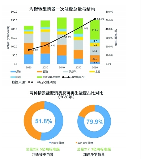 根據(jù)報告,均衡轉(zhuǎn)型情景下,一次能源消費將于2045年前達到峰值267.1億噸標準煤(以發(fā)電煤耗法統(tǒng)計,下同),可再生能源占比逐步上升至2060年的51.8%。能源消費增速逐步放緩,到2060年為252.5億噸標準煤,油氣共計占比為35.7%。加速凈零情景則要求能源消費達峰提前到2035年(241.6億噸標準煤)。需要加快可再生能源發(fā)展并形成集約化的能源生產(chǎn)利用方式,到2060年可再生能源占比達到79.9%,油氣共計占比為10.1%。