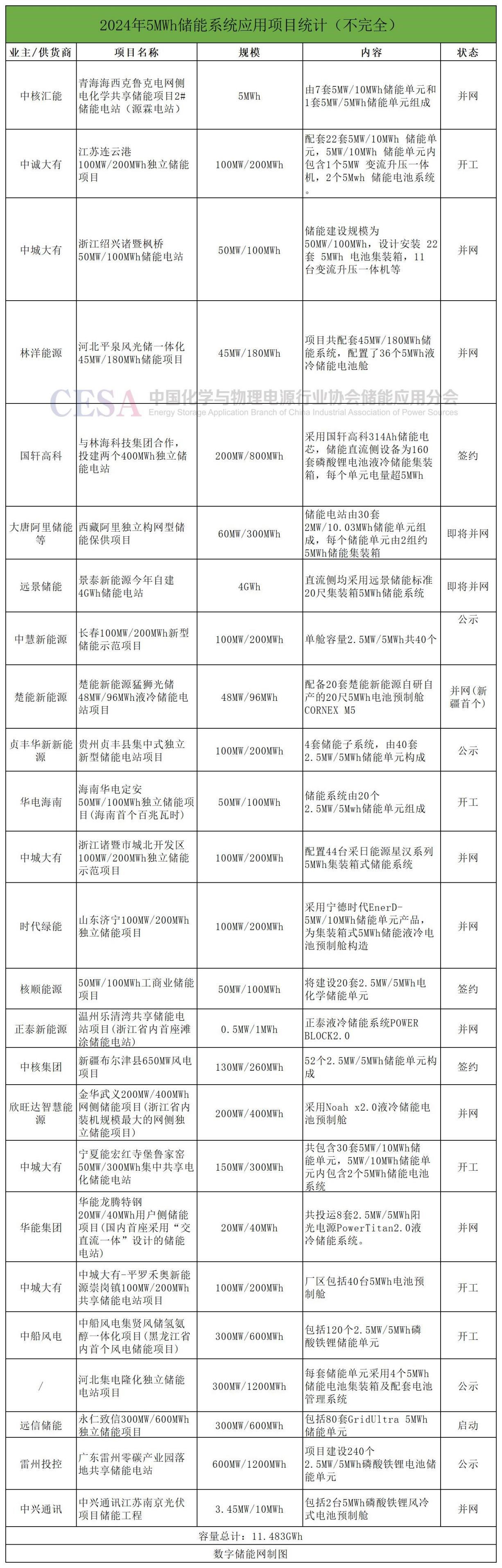據(jù)中國儲能網(wǎng)不完全統(tǒng)計,開工、公示、簽約、并網(wǎng)的5MWh儲能系統(tǒng)應用項目容量超11.48GWh,應用場景包括新能源配儲、獨立儲能、工商業(yè)儲能等。