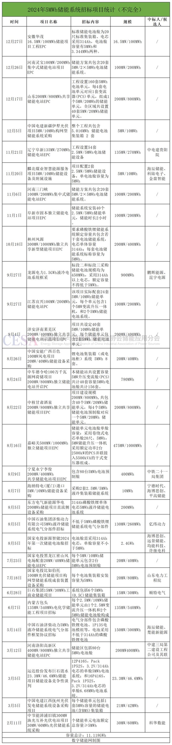 在招投標市場,5MWh儲能系統(tǒng)受認可程度逐漸升高,據(jù)中國儲能網(wǎng)不完全統(tǒng)計,2024年,招投標市場涉及5MWh儲能系統(tǒng)的EPC、PC、設(shè)備等招標項目共30個,容量規(guī)模為11.118GWh。