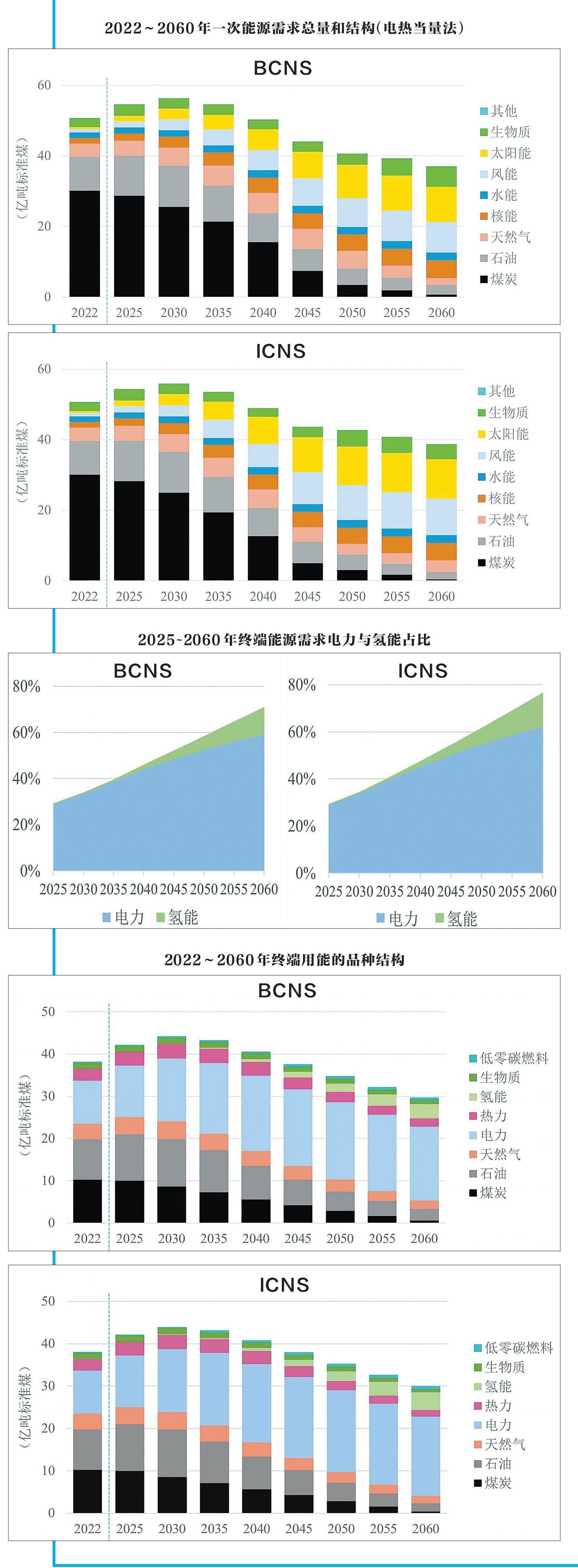 《中國能源轉(zhuǎn)型展望2024》在深入分析全球氣候變化和國際政治經(jīng)濟態(tài)勢的復(fù)雜性后,提出了基準碳中和情景(BCNS)和理想碳中和情景(ICNS)兩種預(yù)測模型。報告指出,經(jīng)過巨大努力,能源轉(zhuǎn)型能為我國實現(xiàn)2060年前經(jīng)濟社會系統(tǒng)的碳中和作出決定性貢獻。到2060年,我國經(jīng)濟規(guī)模將增長為2020年水平的3.3~3.6倍。按當量熱值計算,一次能源消費總量先增加后下降,到2060年,一次能源消費總量比峰值下降1/3左右。BCNS和ICNS兩種情景下,隨著能源轉(zhuǎn)型技術(shù)(包括碳捕集等負碳技術(shù))和相關(guān)產(chǎn)業(yè)加快發(fā)展,我國能源系統(tǒng)可以在2060年前實現(xiàn)凈零碳排放,助力2060年前實現(xiàn)經(jīng)濟社會系統(tǒng)的碳中和。
