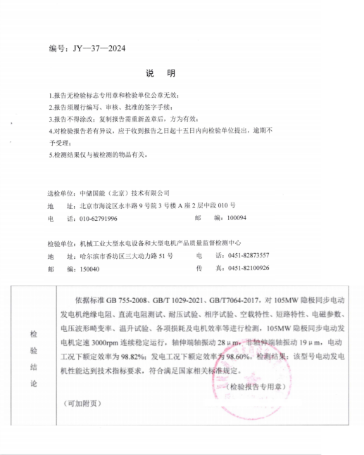 權(quán)威CMA第三方檢驗報告表明:依據(jù)國標歷時近3個月的檢驗時間內(nèi),中儲國能山東肥城的300MW先進壓縮空氣儲能系統(tǒng)核心設(shè)備開展了包括耐壓試驗、空載特性、電機效率在內(nèi)的十余項型式試驗,設(shè)備性能表現(xiàn)卓越。