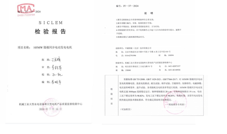 權(quán)威CMA第三方檢驗(yàn)報(bào)告表明:依據(jù)國標(biāo)歷時(shí)近3個(gè)月的檢驗(yàn)時(shí)間內(nèi),中儲國能山東肥城的300MW先進(jìn)壓縮空氣儲能系統(tǒng)核心設(shè)備開展了包括耐壓試驗(yàn)、空載特性、電機(jī)效率在內(nèi)的十余項(xiàng)型式試驗(yàn),設(shè)備性能表現(xiàn)卓越。